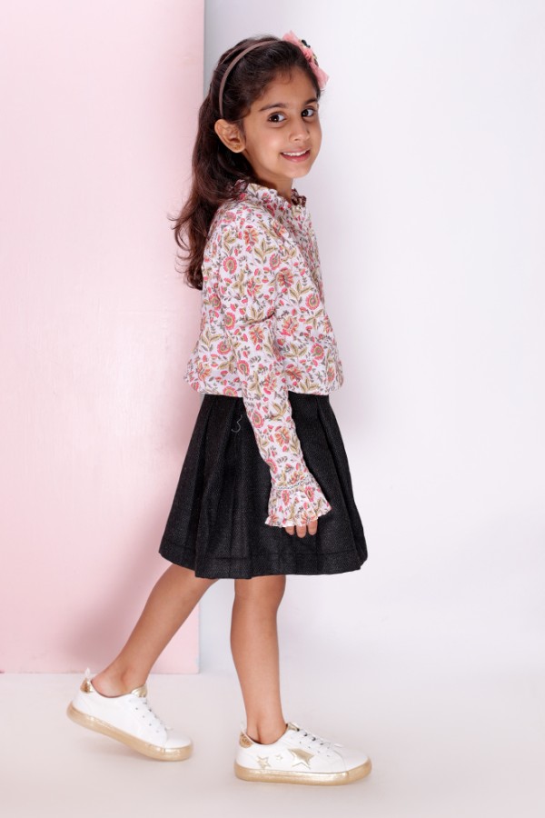 Pink floral block print crop top with an elasticated waist detailed with cute ruffles at the neckline and sleeves co-ordinated with black box pleated skirt.