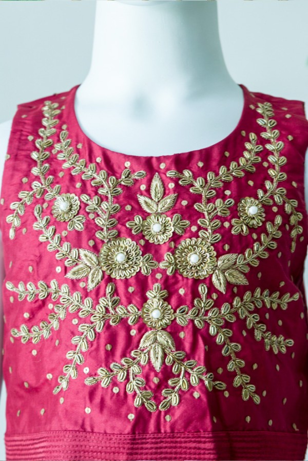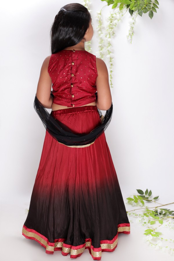 This maroon black shaded crepe lehenga has a sequin border with satin trims at the hemline. It comes with a maroon pure silk blouse and is hand embroidered in sequins and zardozi work. The black net dupatta has scattered sequins with border on all its sides.