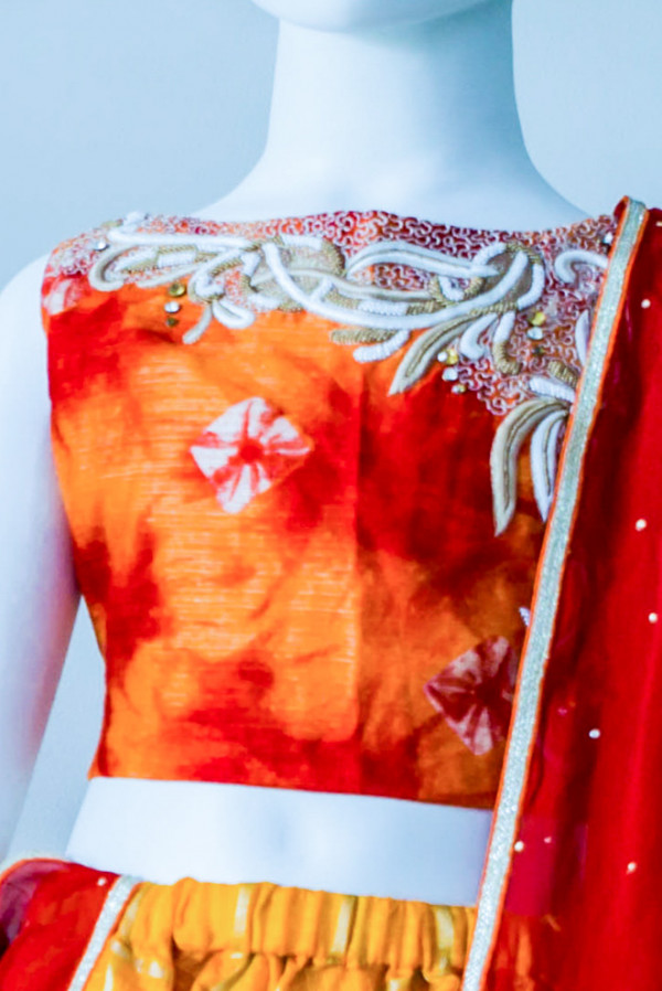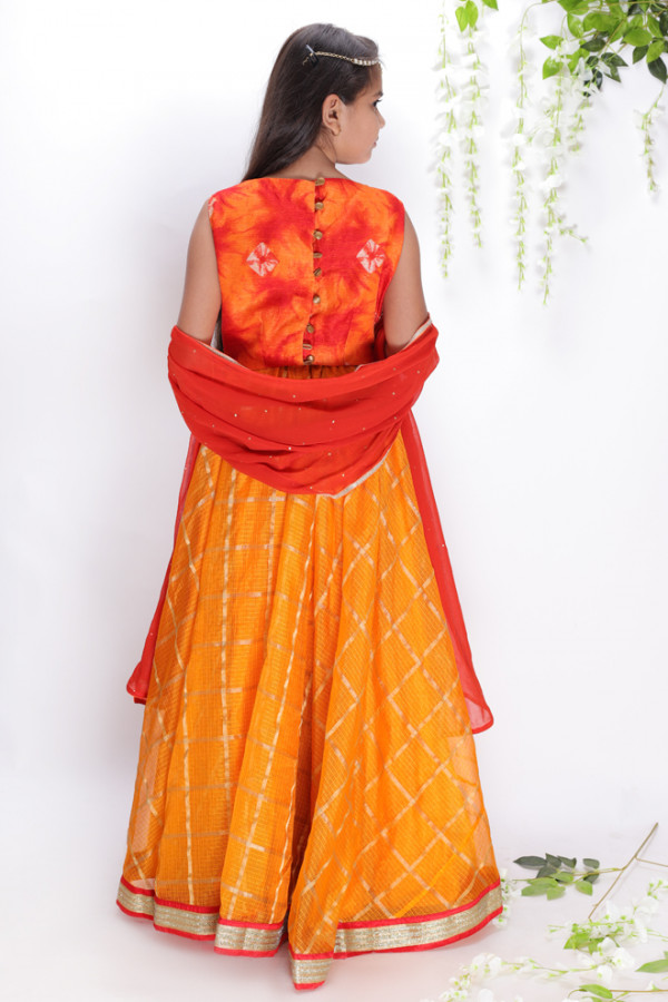 This kota silk lehenga has a gold border with orange detailing on its hem. It comes with a printed orange raw silk blouse which has hand embroidered pearl, bead & thread work and has a back opening with button detailing. The dupatta has stones scattered on it with a small border on all its sides.