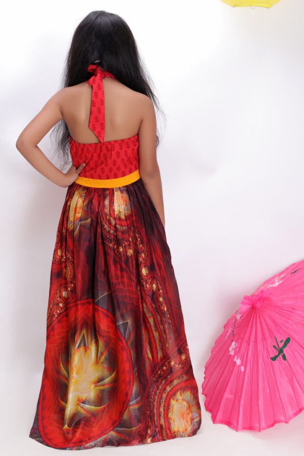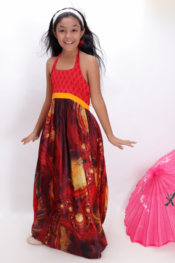 This empire cut floor-length dress has a halter neckline, a hand block printed body, elasticated back, pleated silk lower body and a concealed zip on its side.