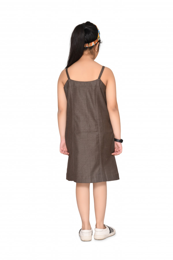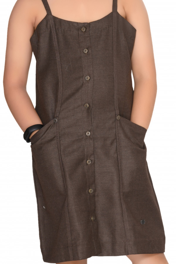 Brown pinafore dress features button down style with stitch-detailed in the front and on the hip pockets on each side.